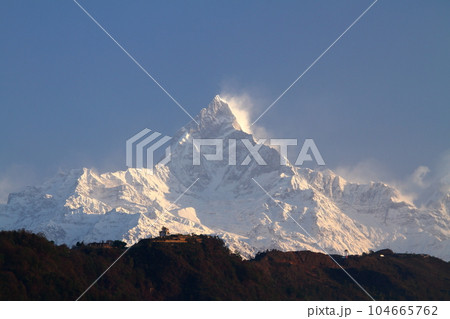 南アジアのネパールポカラ 街の建物屋上から望む夜明けのマチャプチャレ山頂