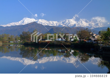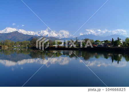 南アジアのネパールポカラ ダムサイドからのマチャプチャレとアンナプルナ山群の眺望とフェワ湖面の水鏡