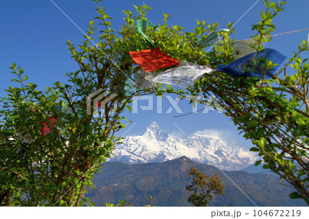 南アジアのネパールポカラ 日本山妙法寺からのヒマラヤ・マチャプチャレとアンナプルナ山群とタルチョー