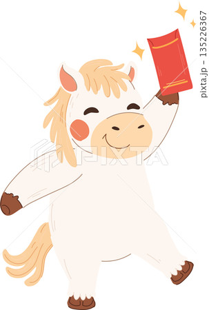 Cute white horse celebrating chinese new year while holding a red envelope. Zodiac animal