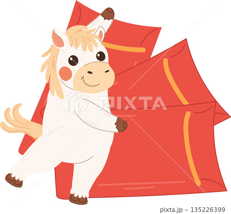 Cute white horse celebrating chinese new year while carrying multiple red envelopes. Zodiac