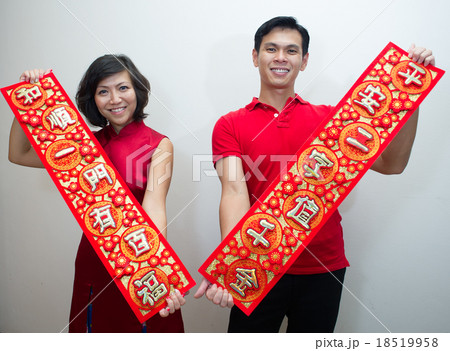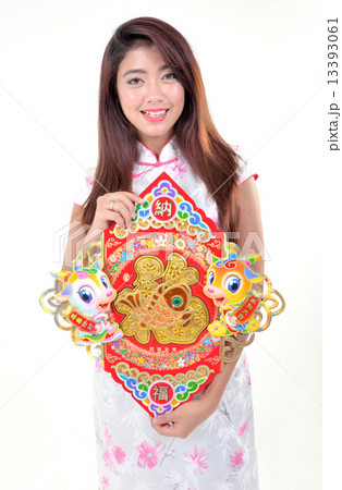 Beautiful young asian woman showing spring festival couplet for chinese new year