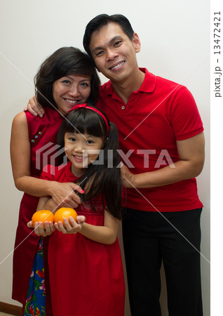 Portrait of a family of three Asian in red posing with mandarin oranges for Lunar / Chinese new year