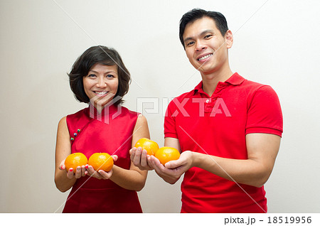 Asian couple dressed in red with oranges for CNY