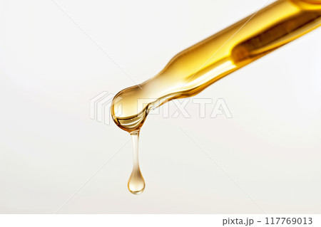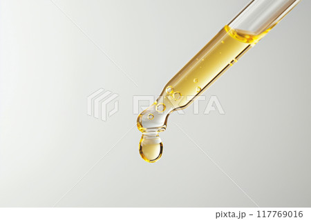 美容液のスポイトから滴る一滴。透明の液体。ピペットの先。