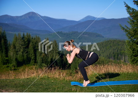 Woman practicing yoga outdoors in the mountains in a serene, natural setting. Female performing yoga pose on blue mat, with backdrop of beautiful mountain landscape at sunrise or sunset.