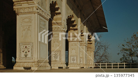 Red Fort Mughal arches and marble columns with dramatic shadow light contrast architectural detail