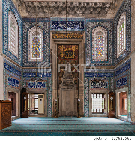 Rustem Pasha Mosque interior with intricate blue Iznik tiles, mihrab, and historic Ottoman architecture, Istanbul, Turkey.
