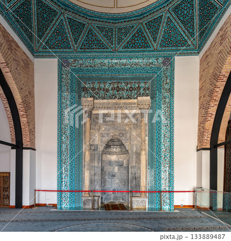Interior of Alaaddin Keykubad Mosque featuring ornate mihrab and intricate turquoise tilework, Konya, Turkey.