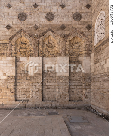 Exterior wall of the Mosque of al-Zahir Baybars, Cairo, Egypt, featuring Mamluk stone carvings and arches
