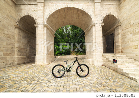 Freestanding mountain bike against the backdrop of architectural arches. MTB cover concept