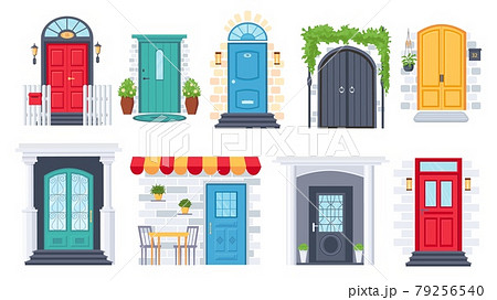Wooden ancient and classic closed front doors set. Entries to apartments, houses and buildings set cartoon vector illustration