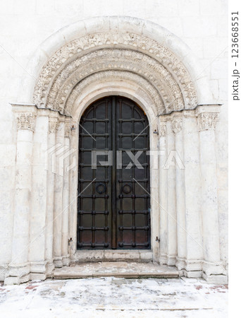 Massive Wooden Entrance Door in Orthodox Church with Arched Design
