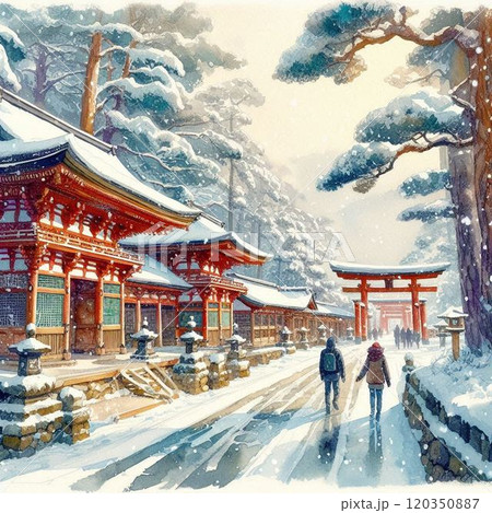 早朝の神社 初詣にやってきた参拝客をイメージして描かれた水彩画