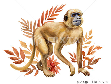 monkey, tropical leaves watercolor isolated on white background, Safari animal, autumn plant. Jungle autumn floral