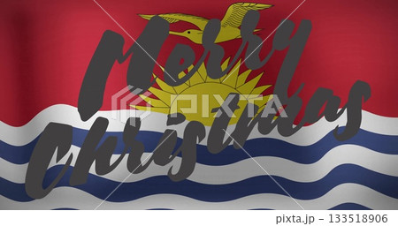 Displaying dark gray cursive Merry Christmas text over Kiribati flag in graphic design