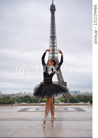 Ballerina dancing in black tutu on pointe in front of Eiffel Tower in Paris