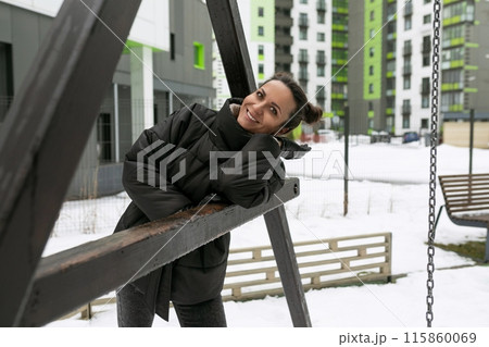 Weekend concept, brunette woman dressed in a black winter jacket walking on the street