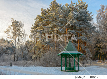Wooden arbour in winter garden