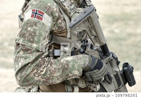Soldier with assault rifle and flag of Norway on military uniform. Collage.