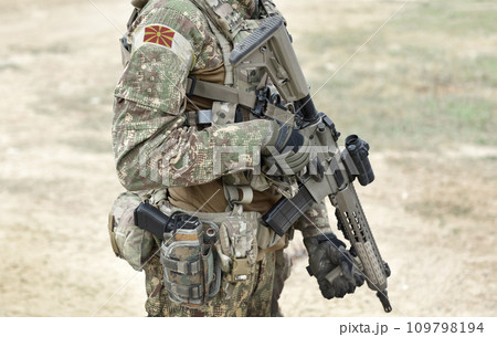 Soldier with assault rifle and flag of North Macedonia on military uniform. Collage.