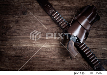 Old west weapon. Colt Revolver and gunbelt with holster on wooden deck.