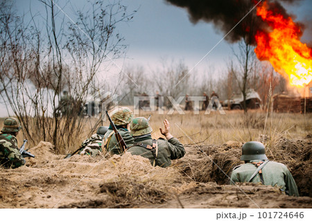 Fight Against Combat Vehicle. Re-enactors Armed Rifles And Dressed As World War Ii German Wehrmacht Infantry Soldiers Fighting Defensively In Trench. Building On Fire On Background