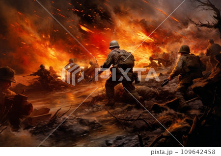 AI-generated content. Soldiers on the battlefield in war, AI Generative