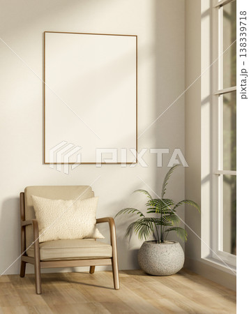 White frame on wall over wooden armchair and potted plant on parquet floor with sunlight from window