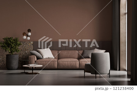 Luxury living room in warm Mocha mousse 2025 color trend. Brown walls, leather lounge furniture.