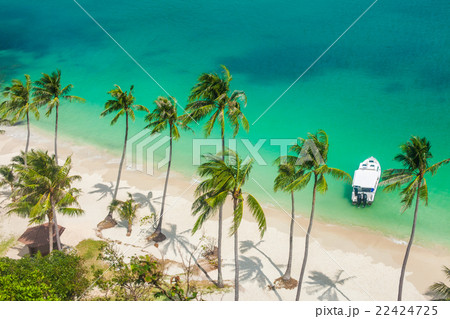 Beautiful aerial view of beach and sea with many tree and white cloud on blue sky in koh samui island