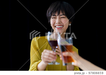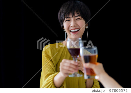 ワインを飲むショートヘアの女性 黒バック