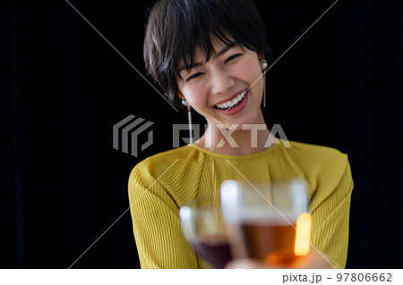 ワインで乾杯をするショートヘアの女性