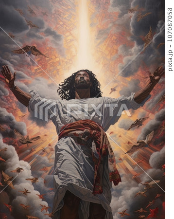 Biblical oil painting of the ascension of African Jesus Christ over the believers AI