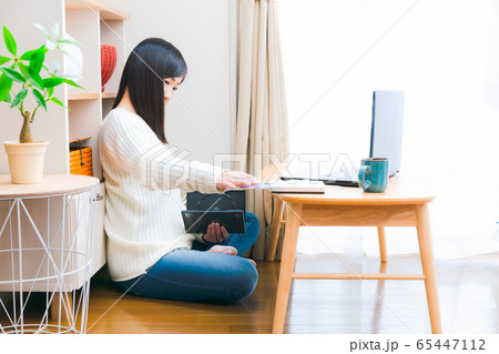 PC ディスクを挿入、取り出す女性 コピースペース