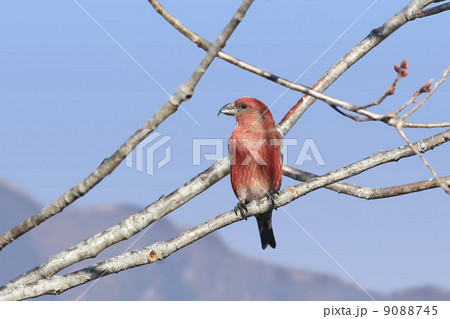 北海道壮瞥町、木の枝にとまる雄のイスカ【3月】
