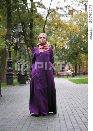 beautiful Muslim woman in the modern Islamic dress walk in a city park