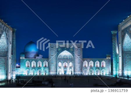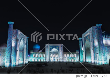 ウズベキスタン・サマルカンド レギスタン広場のライトアップ