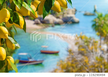 Bunches of yellow ripe lemons with green leaves. Narrow path connects island to Taormina beach in azure waters of Ionian Sea, Sicily, Italy.
