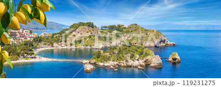 Panoramic view of Isola Bella, small island near Taormina, Sicily, Italy.