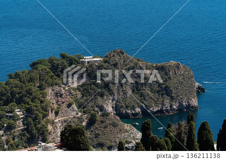 Beautiful Isola Bella, small island near Taormina, Sicily, Italy. Narrow path connects island to mainland Taormina beach surrounded by azure waters of Ionian Sea.