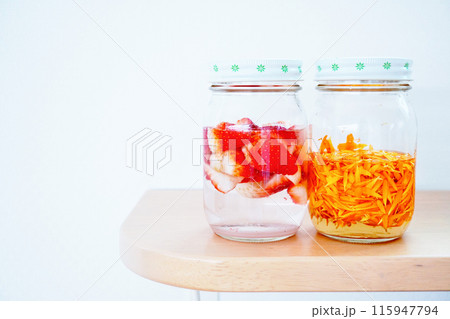 白バックにいちごのカレンデュラの花びらの天然パン酵母の仕込み