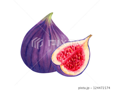 Hand drawn watercolor section of fig. Hand drawn illustration of organic snack for healthy diet. Edible fresh fruit of ficus carica. Ingredient for jam making, dessert recipe, logo and label
