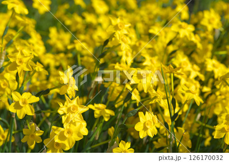 春の公園に咲く黄色い小さなイトバスイセン(糸葉水仙)の花