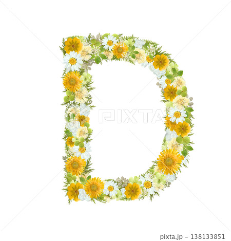 アルファベットのDの押し花素材 黄色と緑の花を敷き詰めたボタニカル文字 背景透過PNG