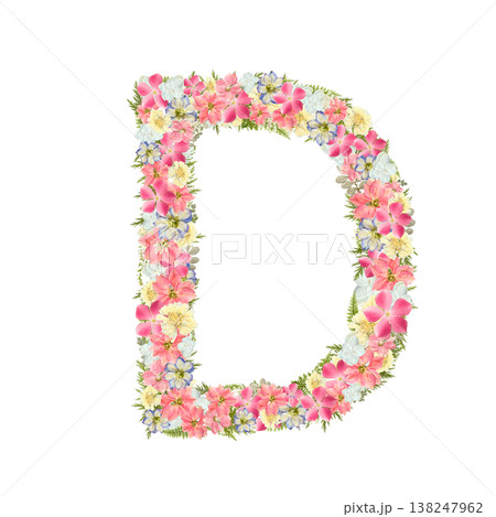 アルファベットのDの押し花素材 繊細なセリフ体 ピンクとブルーのボタニカル文字 背景透過PNG