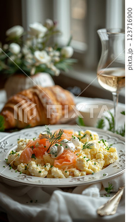 In an elegant brunch setting, a fine china plate showcases creamy scrambled eggs topped with smoked salmon, dill, and crame frache