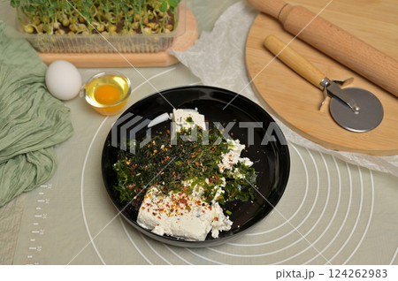 Parsley and dill greens with cottage cheese in a black bowl. Rolling pin, cutter, eggs, green towel and microgreens sprouts on kitchen table. Home cooking baking puffs