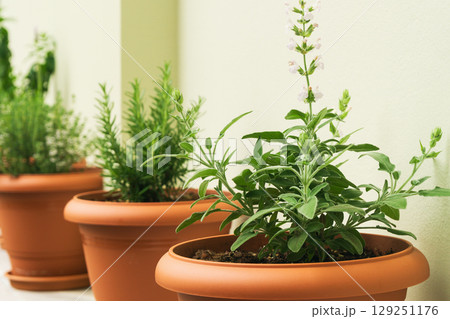 Herbs in clay pots thrive in a kitchen garden for sustainable cooking and healthy meals