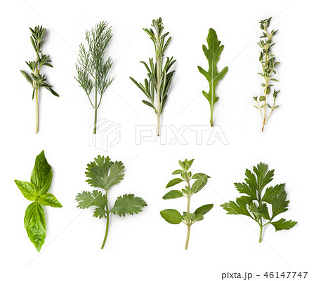 Culinary herbs set. Parsley, basil thyme, mint and oregano pack. Vector hand drawn doodle collection illustration isolated on white background.